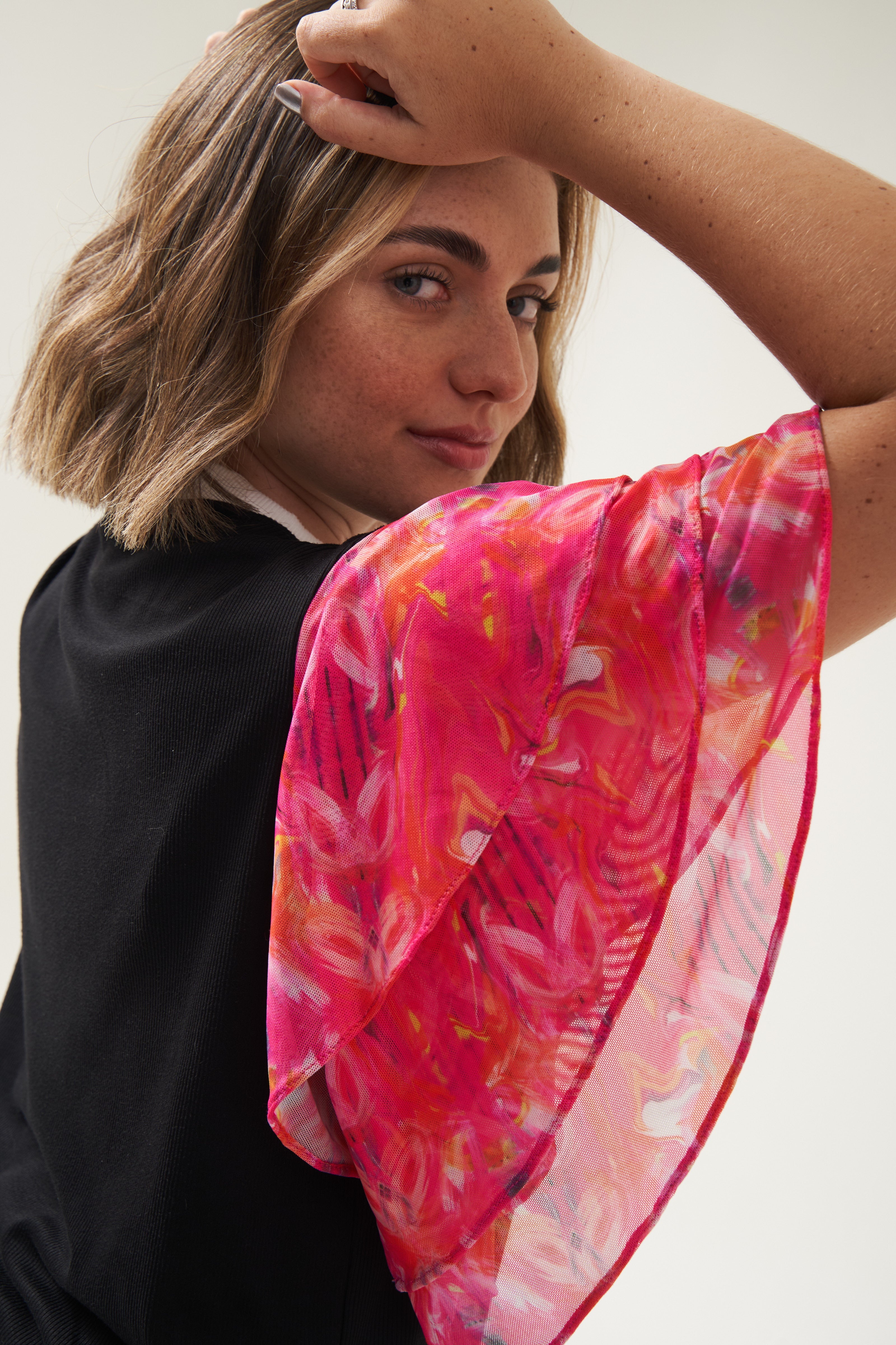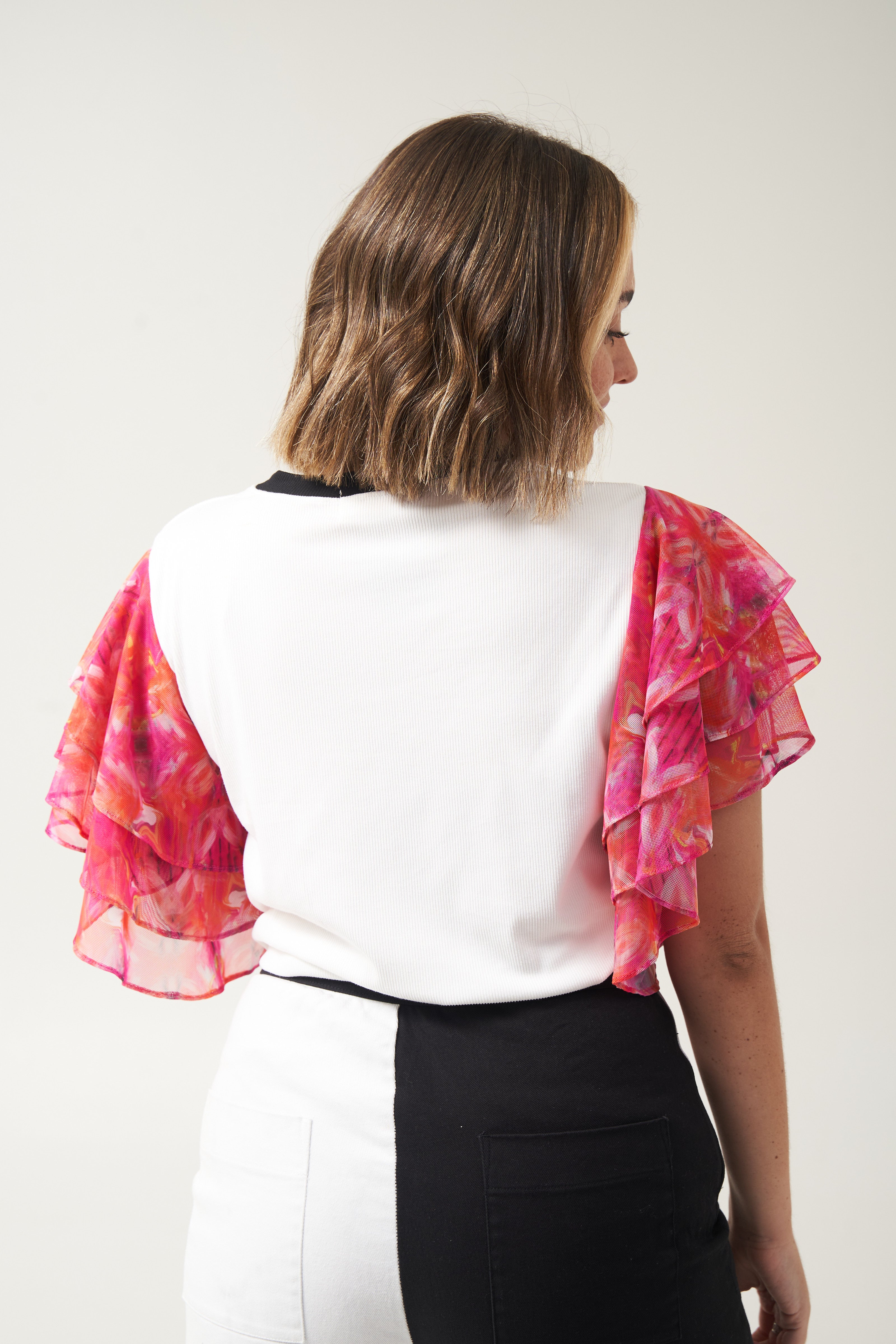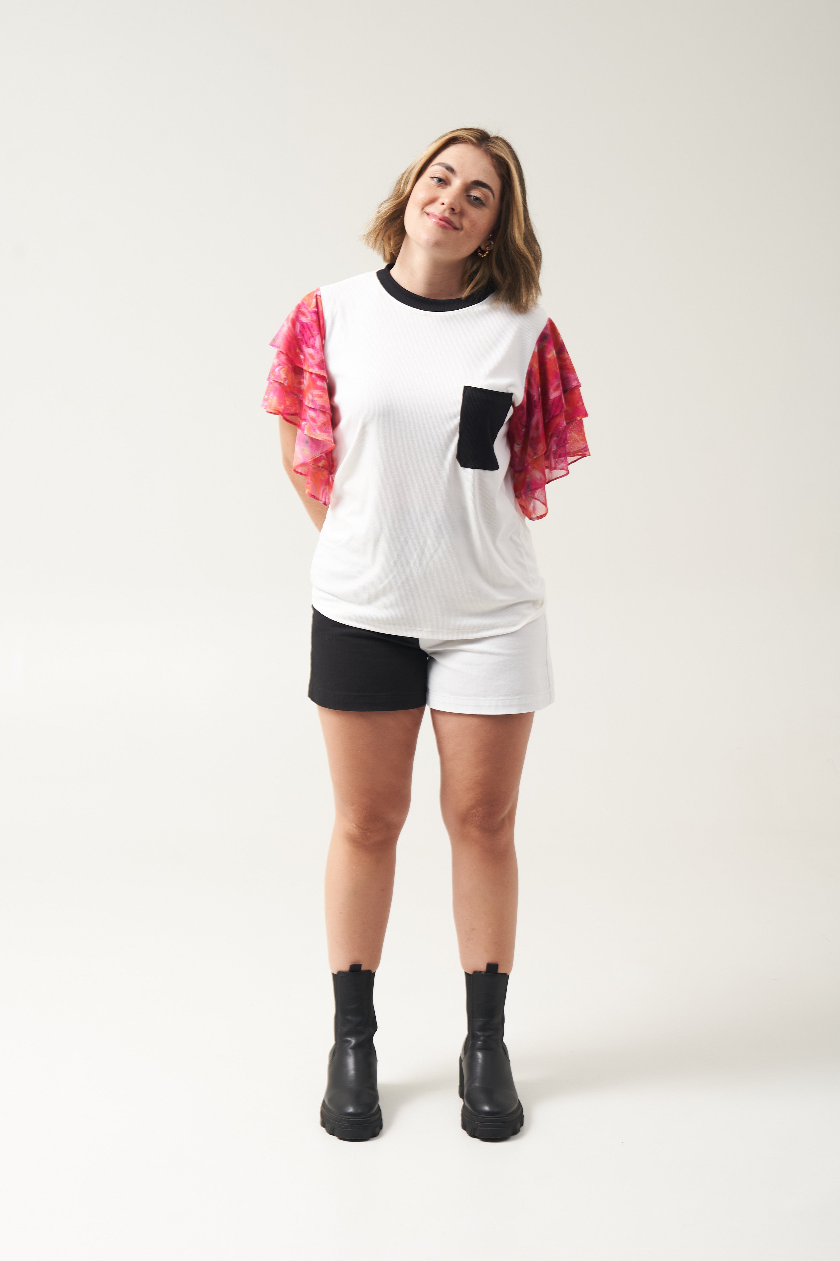 ¡Nos encantan los básicos!, en realidad no tanto, pero nuestra contadora nos dijo que debíamos venderlos, así que decidimos hacer esta camiseta CERO básica, con unas mangas en malla de 3 golas, porque para qué solo una y con nuestros colores del momento, duales y opuestos, como lo son el blanco y negro.